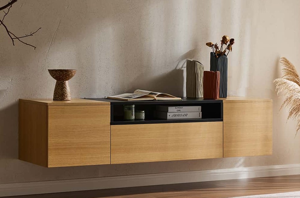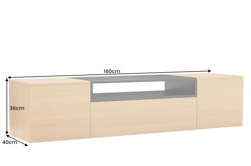 Dit hangende TV-meubel combineert tijdloos ontwerp met doordachte functionaliteit. De combinatie van een kastombouw in eiken kleur en elegante accenten in zwart zorgt voor een moderne kleurcombinatie. De zwevende wandbevestiging zorgt ervoor dat het meubelstuk elegant oogt.