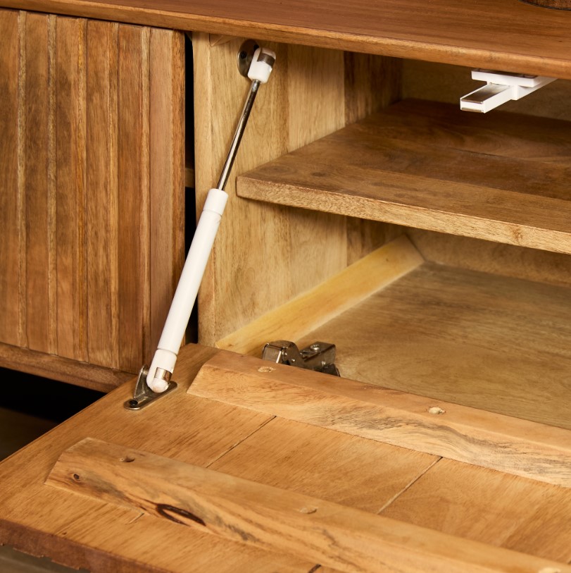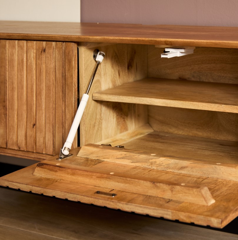 Modern zwevend  tv meubel gemaakt van massief mangohout en voorzien van twee deuren met hoogwaardige 'push-to-open' sluitsysteem. Het model kenmerkt zich door zijn strakke uitstraling en zijn greep loze deurtjes. Het meubel is afgewerkt met een naturel lak.