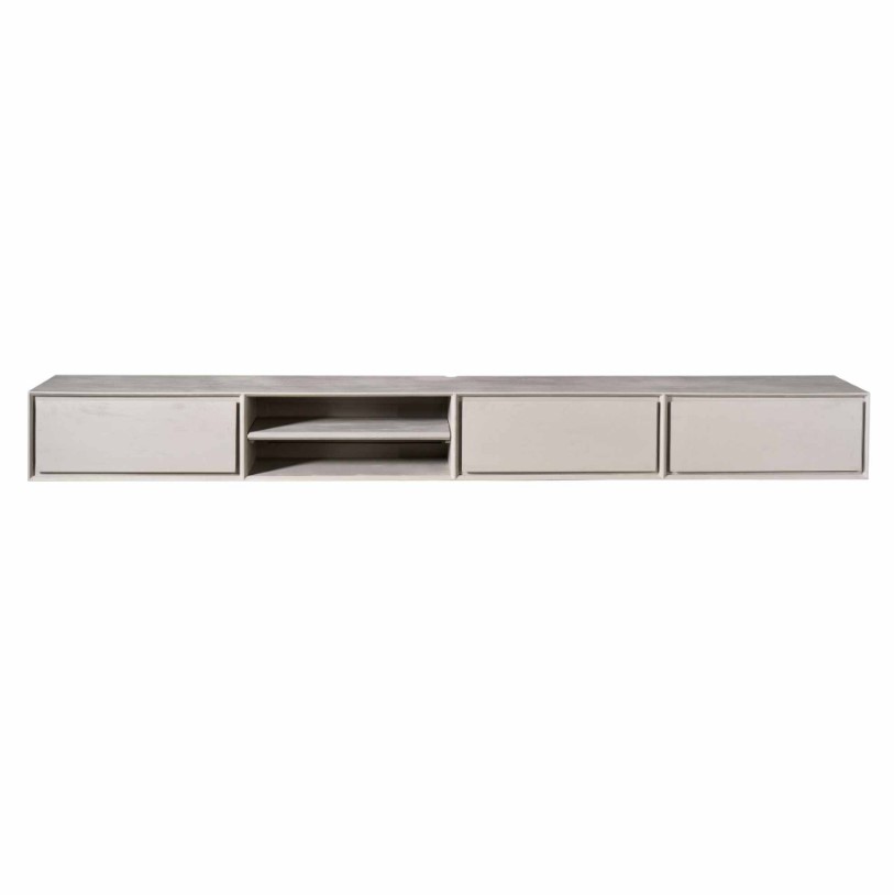 Stijlvol zwevend tv-meubel taupegrijs, gemaakt van massief mangohout. Het zwevende ontwerp schept een gevoel van ruimte in de woonkamer, waardoor een luchtige en open sfeer ontstaat. Dit tv-meubel is voorzien van twee open vakken en drie greeploze lades.