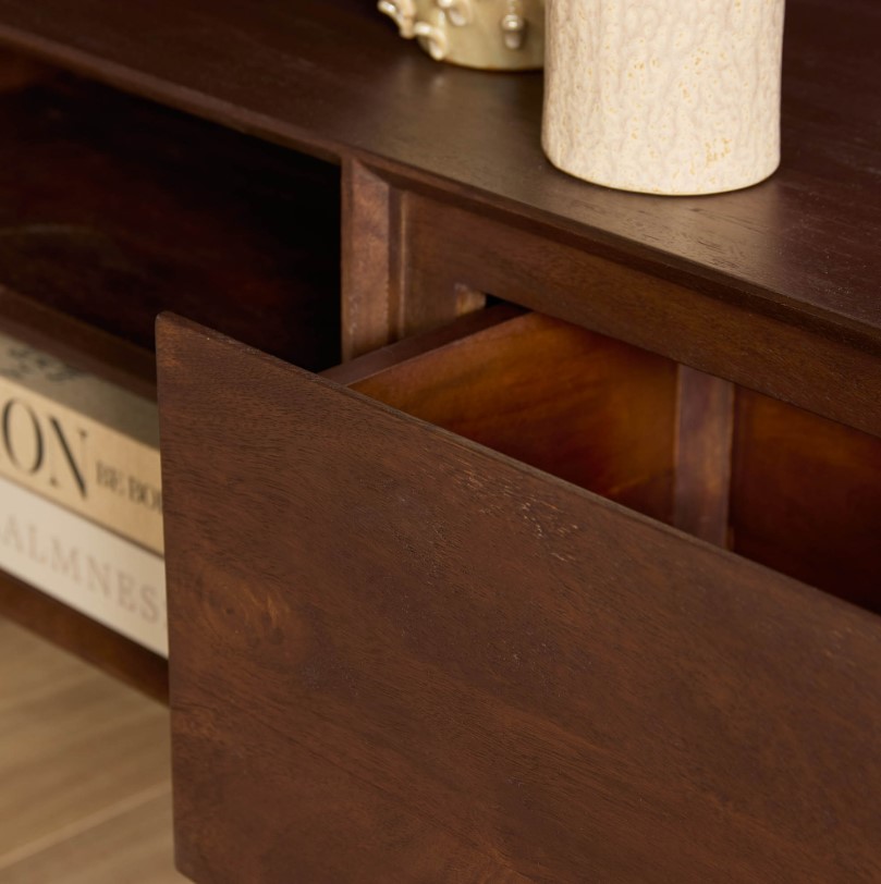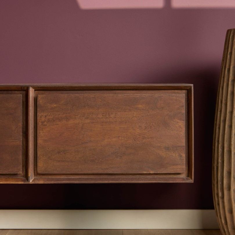 Strak modern zwevend tv-meubel donkerbruin, gemaakt van massief mangohout. Het zwevende ontwerp schept een gevoel van ruimte in de woonkamer, waardoor een luchtige en open sfeer ontstaat. Dit tv-meubel is voorzien van twee open vakken en drie greeploze lades. Het bovenblad is voorzien van een kabelopening.