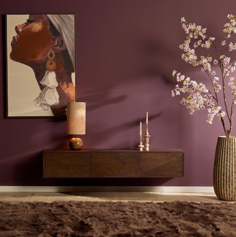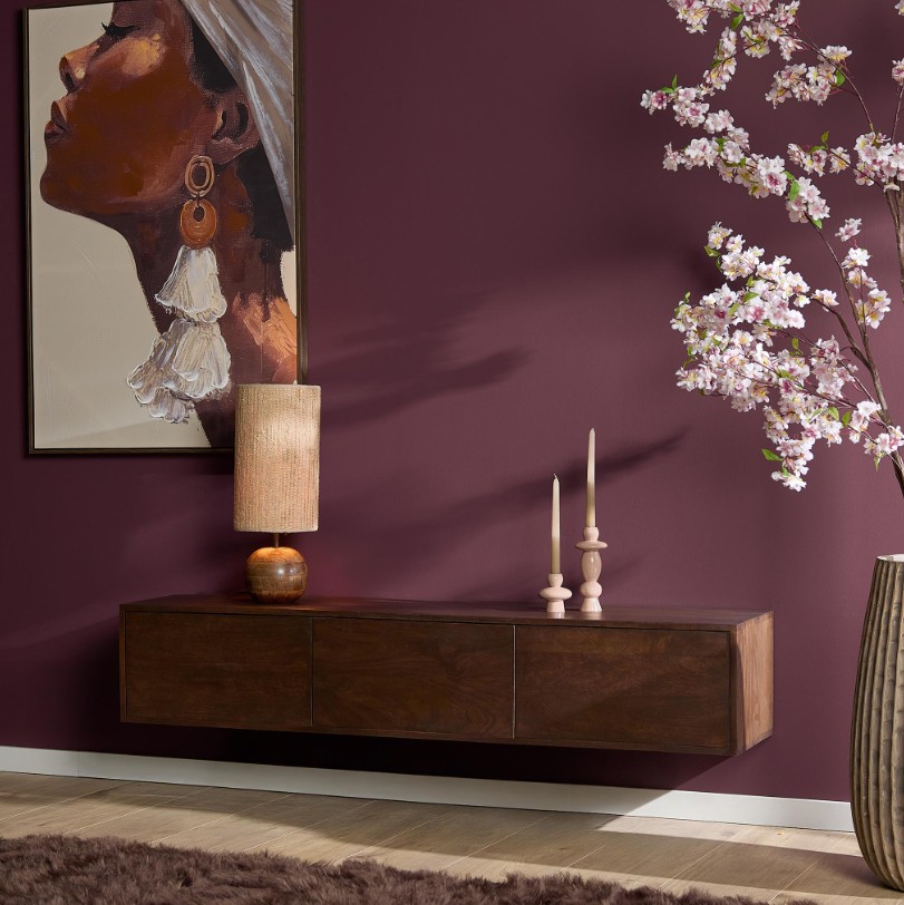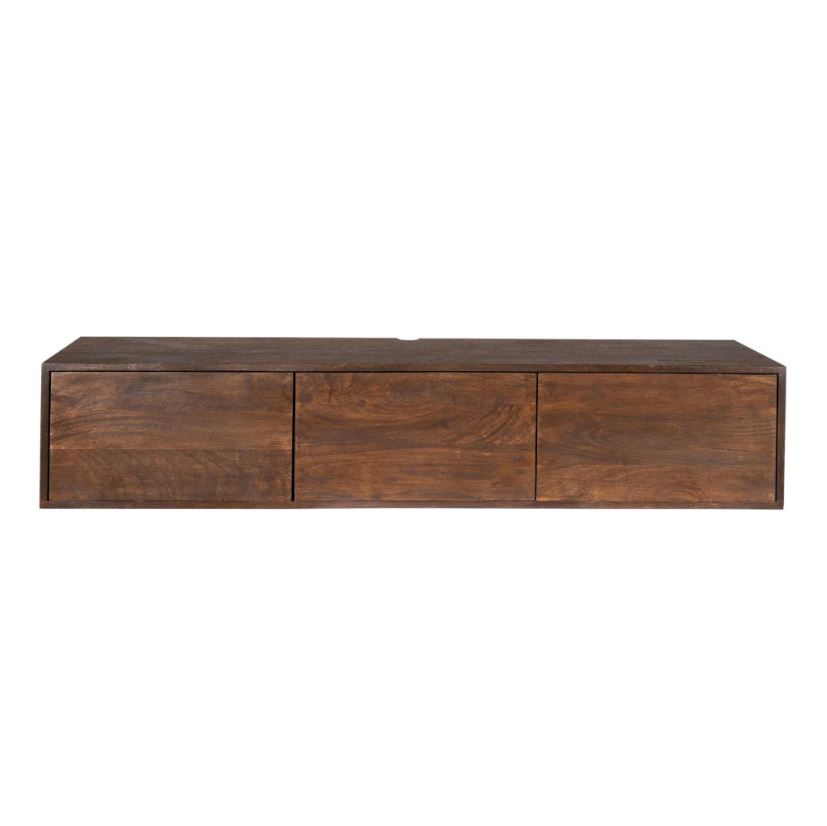 Modern zwevend  tv meubel gemaakt van massief mangohout en voorzien van drie deuren met hoogwaardige 'push-to-open' sluitsysteem. Het model kenmerkt zich door zijn strakke uitstraling en zijn greep loze deurtjes. Het meubel is afgewerkt met een lak in donkerbruine kleur.