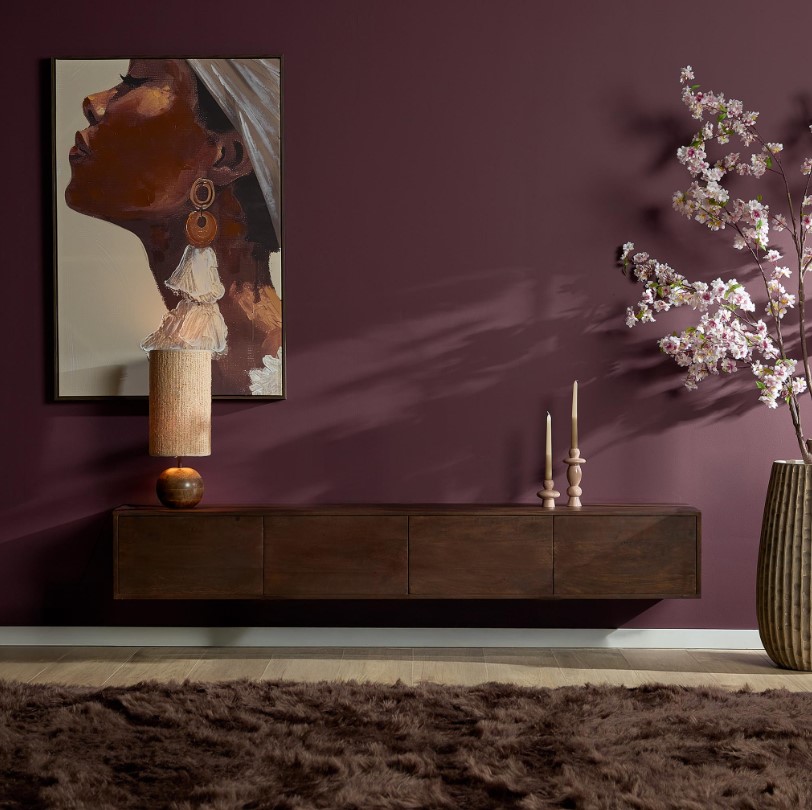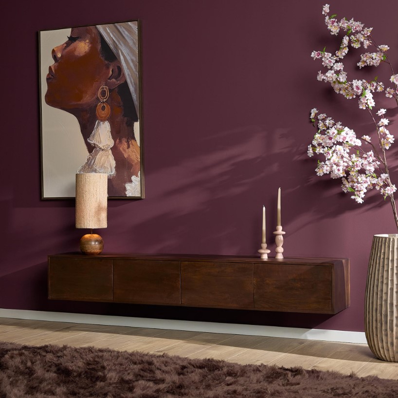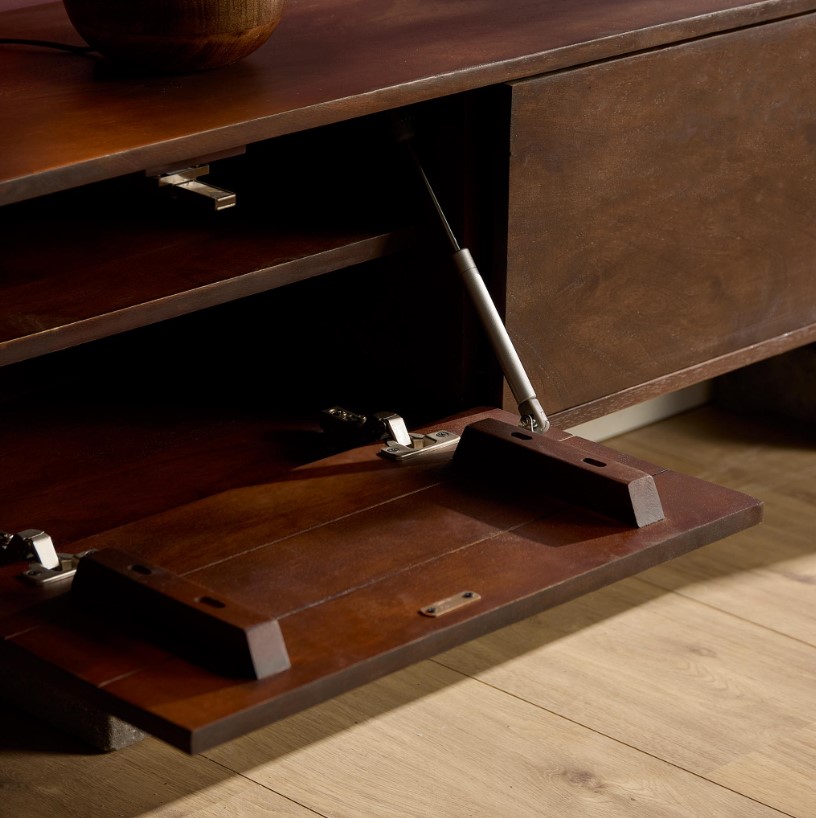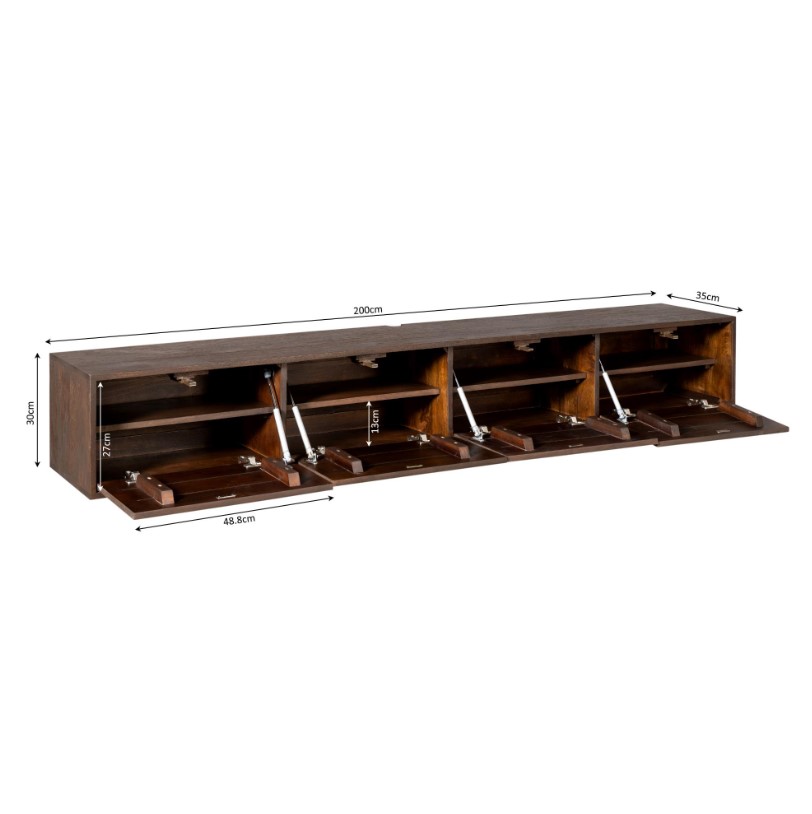 Modern zwevend tv meubel gemaakt van massief mangohout en voorzien van vier deuren met hoogwaardige 'push-to-open' sluitsysteem. Het model kenmerkt zich door zijn strakke uitstraling en zijn greep loze deurtjes. Het meubel is afgewerkt met een lak in een donkerbruine finish.