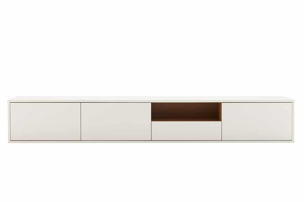Dit hangende TV-meubel combineert tijdloos ontwerp met doordachte functionaliteit. De combinatie van een kastombouw in witte kleur en elegante accenten in eiken zorgen voor een moderne kleurcombinatie. De zwevende wandbevestiging zorgt ervoor dat het meubelstuk een echte design uitstraling krijgt.