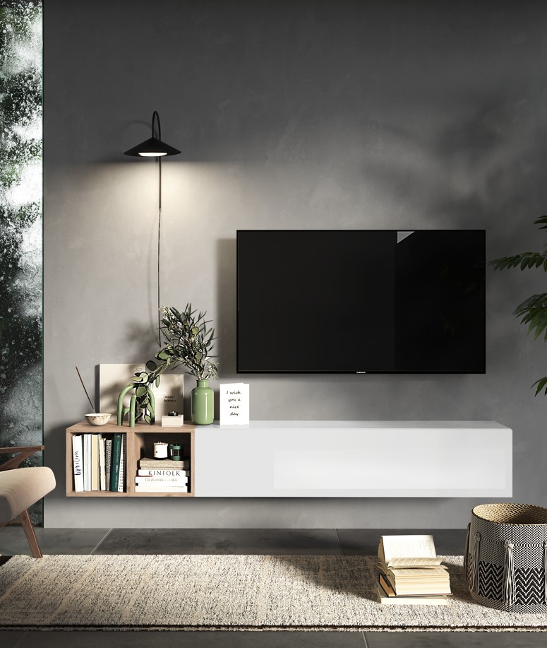 Zwevende tv-meubel combinatie met hangkast in hoogglans wit gecombineerd met decoratieve open kasten in de kleur donker eiken.