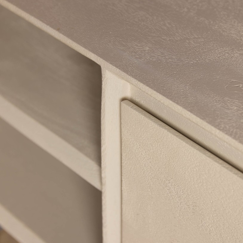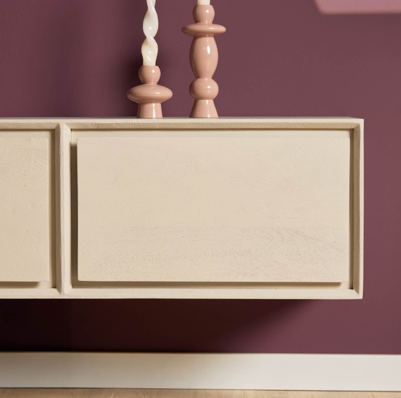 Stijlvol zwevend tv-meubel zandbeige, gemaakt van massief mangohout. Het zwevende ontwerp schept een gevoel van ruimte in de woonkamer, waardoor een luchtige en open sfeer ontstaat. Dit tv-meubel is voorzien van twee open vakken en twee greeploze lades.