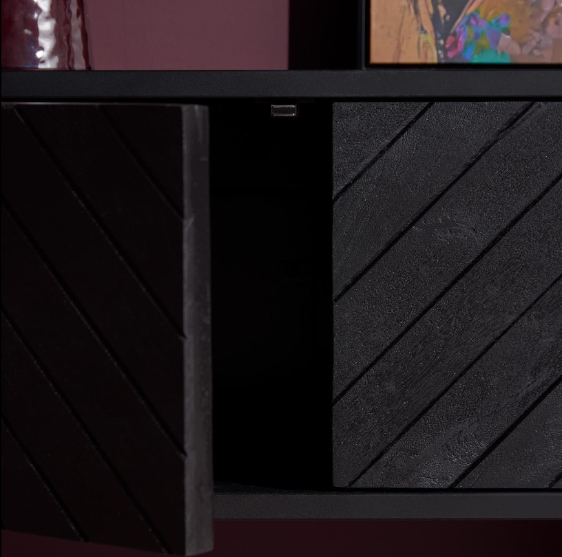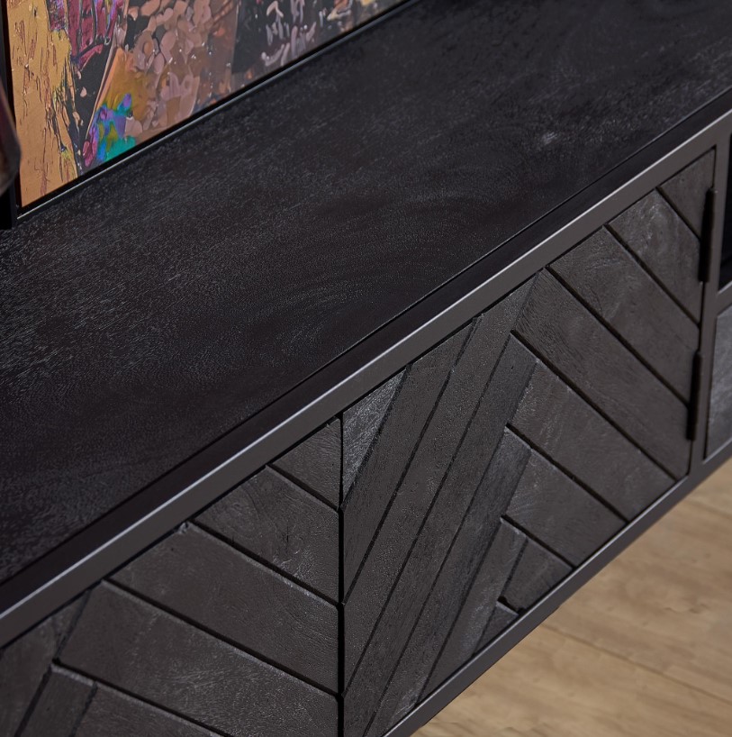 Dit TV-meubel is gemaakt van gezandstraald massief mangohout en afgewerkt met een moderne zwarte lak. De deuren zijn voorzien van visgraatpatronen die het meubel een unieke en verfijnde look geeft, terwijl het open vak een praktische oplossing biedt om je audio apparatuur of decoratieve spullen overzichtelijk en stijlvol op te bergen en tentoon te stellen.